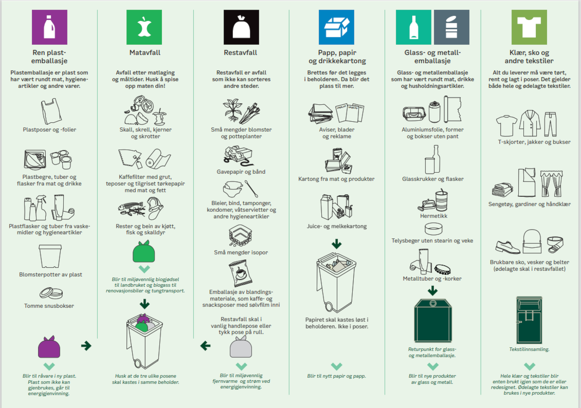 - Matavfall skal i grønne poser: Matrester generelt, slik som skall, skrell, skrotter, teposer, tørkepapir og bein. Ikke kast planterester, hageavfall, kattesand, bleier og emballasje tilgriset av matavfall. Dette skal i restavfallet.